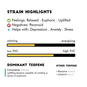 This is a unique strain that was created by crossing San Fernando Valley OG with Triangle Kush. Its exceptional flavor, aroma, and potential effects are attributed to the dominant terpenes Limonene and Myrcene. This strain may uplift mood and promote relaxation, making it a great choice for those looking for a calming experience.